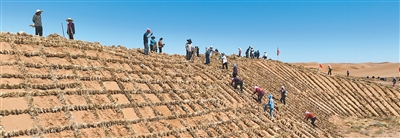 宁夏中卫市,当地治沙人员正用麦草方格固沙。 |