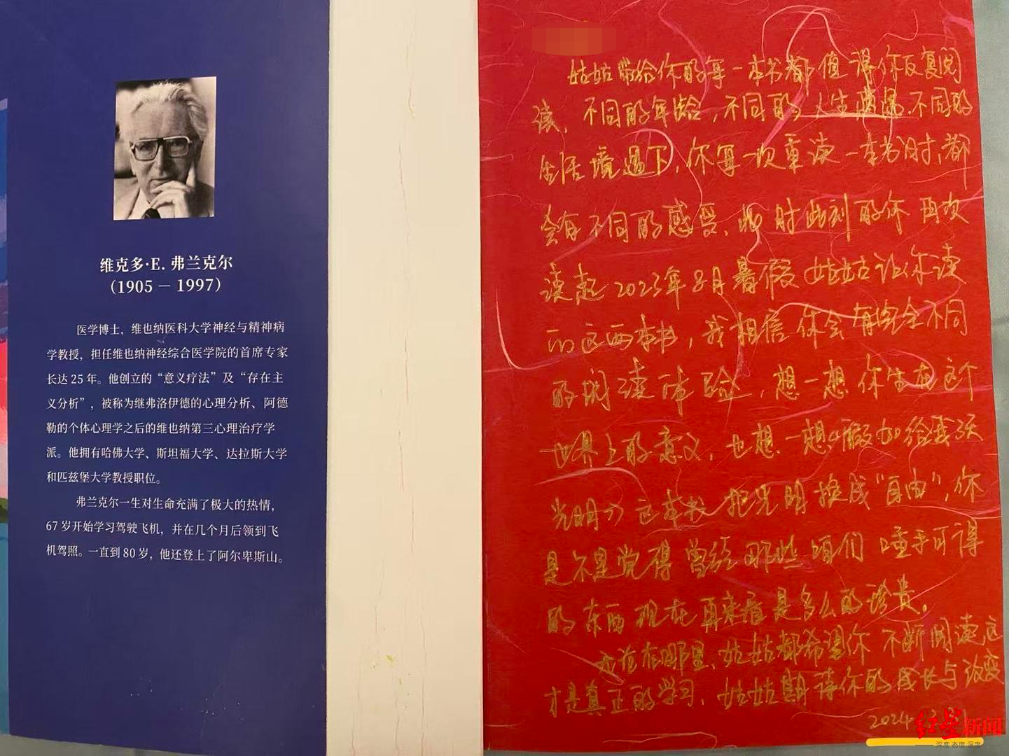 ▲张晓在《活出生命的意义》扉页留言 受访者供图