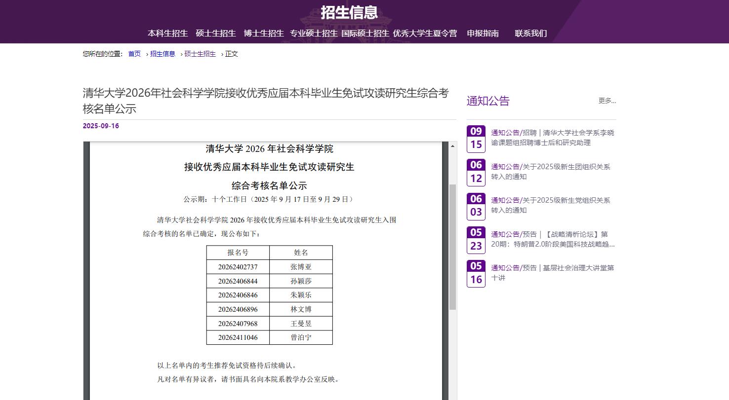 9月16日,清华大学2026年社会科学学院接收优秀应届本科毕业生免试攻读研究生综合考核名单公示,孙颖莎、王曼昱榜上有名。