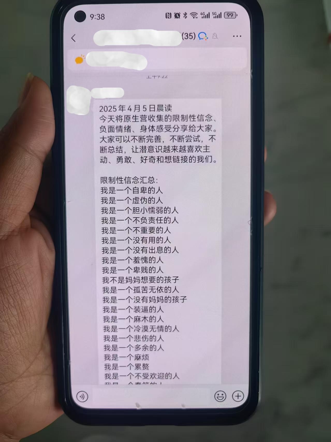 刘言进一步说道:“后边就发现问题太多了,他是疗愈祖先创伤为后代积福,我们被错误观念植入,被洗脑了。我就是担心孩子的心理成长,所以愿意掏这么多钱学,结果越学越差。本来我家孩子就是上学跟同学关系不太好,现在孩子昼夜颠倒,手机成瘾了,还得慢慢往回调。课程就是让妈妈躺平,把孩子撂倒,都躺平。”